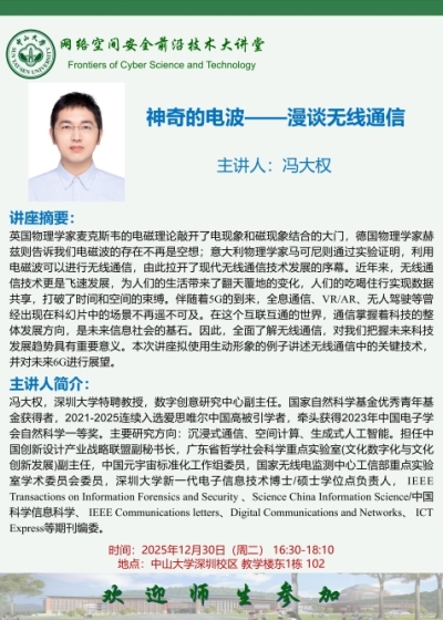网络空间安全学院足球队获中山大学2025年“逸仙杯”乙级联赛总冠军 2025年11月,网络空间安全学院2024级鸿网创新班正式开班 中山大学网络空间安全学院2025届毕业生合影留念 2023年4月,高松校长在我院调研 2024年2月,网络空间安全学院召开学院高质量发展大会 学院新闻 2026-01-01 网络空间安全学院2026年新年贺词 2025-12-29 安全顶会S&P论文+2!赵朴凝副教授连续两年论文获IEEE S&P录用 2025-12-25 网络空间安全学院获批2025年度深圳市重点实验室! 2025-12-22 中山大学网安学院“人工智能与网络安全”中学生冬令营招生啦! 2025-12-18 我院本科生论文被CCF A类国际顶级会议AAAI 2026接收 更多 01 2026-01 网络空间安全学院2026年新年贺词 29 2025-12 安全顶会S&P论文+2!赵朴凝副教授连续两年论文获IEEE S&P录用 25 2025-12 网络空间安全学院获批2025年度深圳市重点实验室! 22 2025-12 中山大学网安学院“人工智能与网络安全”中学生冬令营招生啦! 18 2025-12 我院本科生论文被CCF A类国际顶级会议AAAI 2026接收 通知公告 学院通知 党建通知 人才培养 人才招聘 招生信息 20 2026-01 中山大学网络空间安全学院2026年“申请-考核”制招收博士研究生调剂复试综合考核结果公示(第一批) 13 2026-01 中山大学网络空间安全学院2026年“申请-考核”制招收博士研究生调剂复试名单通知(第一批) 06 2026-01 网络空间安全学院2026年“申请-考核”制招收博士研究生调剂公告(第一批) 23 2025-12 中山大学网络空间安全学院“人工智能与网络安全”冬令营收费公示 23 2025-10 中山大学网络空间安全学院2026年博士研究生招生简章 09 2025-10 网络空间安全学院2026年招收硕士研究生Q&A 31 2025-12 网络空间安全学院召开2025年度教职工大会暨工会会员大会 18 2025-12 我院王长磊老师荣获广东高校共青团团前教育说课比赛省级二等奖 13 2025-12 一堂党课,三万心声:中山大学2025年第三次党员集中大课再次掀起学习热潮 04 2025-12 我院学生第二党支部开展“湾区发展与青年责任担当”主题党日活动 25 2025-11 党建共建 | 网络空间安全学院与先进能源学院组织赴东江纵队纪念馆学习 25 2025-11 党建共建 | 网络空间安全学院与中国电信深圳市光明区分公司开展党建共建交流 16 2025-09 中山大学网络空间安全学院2026年接收优秀应届本科毕业生推荐免试攻读研究生预报名通知(直博第二批) 16 2025-09 中山大学网络空间安全学院2026年接收优秀应届本科毕业生推荐免试攻读研究生预报名通知(直博第二批) 05 2025-08 中山大学网络空间安全学院2026年接收优秀应届本科毕业生推荐免试攻读研究生预报名通知 05 2025-08 中山大学网络空间安全学院2026年接收优秀应届本科毕业生推荐免试攻读研究生预报名通知 08 2025-12 中山大学第十六届国际青年学者论坛 网络空间安全学院分论坛,诚盼您来! 11 2025-11 网络空间安全学院人才见面会 | 新加坡站,诚邀您参加! 17 2025-03 中山大学网络空间安全学院人才见面会 | 北京站,诚邀您参加 05 2025-03 2025年度海外优青|中山大学网络空间安全学院诚邀全球青年学者依托申报 05 2025-03 中山大学网络空间安全学院诚邀海内外英才加盟 20 2026-01 中山大学网络空间安全学院2026年“申请-考核”制招收博士研究生调剂复试综合考核结果公示(第一批) 13 2026-01 中山大学网络空间安全学院2026年“申请-考核”制招收博士研究生调剂复试名单通知(第一批) 06 2026-01 网络空间安全学院2026年“申请-考核”制招收博士研究生调剂公告(第一批) 23 2025-10 中山大学网络空间安全学院2026年博士研究生招生简章 09 2025-10 网络空间安全学院2026年招收硕士研究生Q&A 16 2025-09 中山大学网络空间安全学院2026年接收优秀应届本科毕业生推荐免试攻读研究生预报名通知(直博第二批) 学术活动 【网络空间安全前沿技术大讲堂】神奇的电波——漫谈无线通信 冯大权 教授 中山大学深圳校区 教学楼东1栋 102 2025年12月30日 16:30 - 2025年12月30日 18:10 网安研途|本研身份转变系列讲座——独立科研探索 蒋彧琛 助理教授 中山大学深圳校区 工学园2栋 711 2025年12月24日 11:00 - 2025年12月24日 12:00 【网络空间安全前沿技术大讲堂】AI时代的大学学习 黄继武 教授 中山大学深圳校区 教学楼东1栋 102 2025年11月18日 16:30 - 2025年11月18日 18:10 【网络空间安全前沿技术大讲堂】可信智能化软件工程:人工智能打开的空间和带来的挑战 李宣东 教授 中山大学深圳校区 东2-206 2024年05月28日 16:30 - 2024年05月28日 18:10 【网络空间安全前沿技术大讲堂】软件定义汽车:趋势与挑战 彭鑫 教授 中山大学深圳校区 东2-206 2022年05月28日 16:30 - 2022年05月28日 18:10 【网络空间安全前沿技术大讲堂】生成式压缩编码的技术思考 王诗淇 副教授 中山大学深圳校区 东2-206 2024年05月14日 16:30 - 2024年05月14日 18:10 更多
