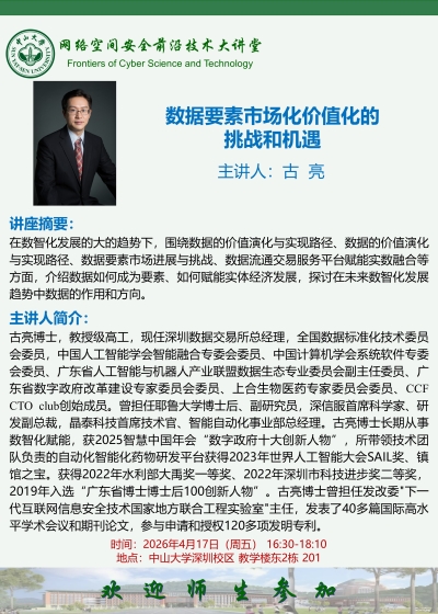 网络空间安全学院足球队获中山大学2025年“逸仙杯”乙级联赛总冠军 2025年11月,网络空间安全学院2024级鸿网创新班正式开班 中山大学网络空间安全学院2025届毕业生合影留念 2023年4月,高松校长在我院调研 2024年2月,网络空间安全学院召开学院高质量发展大会 学院新闻 2026-04-12 操晓春教授获评中国电子学会会士并为学会64周年寄语 2026-04-01 校企协同创新 | 沈力副教授获批CAAI-腾讯犀牛鸟研究计划项目 2026-03-27 2026海外优青 | 网络空间安全学院诚邀全球青年学者依托申报 2026-03-27 服务西部发展 | 我院戴望辰副教授获批国网项目 2026-03-27 智汇光明 | CCF C³走进中山大学深圳校区 更多 12 2026-04 操晓春教授获评中国电子学会会士并为学会64周年寄语 01 2026-04 校企协同创新 | 沈力副教授获批CAAI-腾讯犀牛鸟研究计划项目 27 2026-03 2026海外优青 | 网络空间安全学院诚邀全球青年学者依托申报 27 2026-03 服务西部发展 | 我院戴望辰副教授获批国网项目 27 2026-03 智汇光明 | CCF C³走进中山大学深圳校区 通知公告 学院通知 党建通知 人才培养 人才招聘 招生信息 27 2026-03 中山大学网络空间安全学院2026年硕士研究生招生复试递补拟录取名单(第一批) 24 2026-03 中山大学网络空间安全学院2026年硕士研究生招生复试结果 18 2026-03 网络空间安全学院2026年硕士研究生复试录取实施细则 06 2026-03 网络空间安全学院开通“院长、书记信箱” 13 2026-01 中山大学网络空间安全学院2026年“申请-考核”制招收博士研究生调剂复试名单通知(第一批) 06 2026-01 网络空间安全学院2026年“申请-考核”制招收博士研究生调剂公告(第一批) 07 2026-04 网络空间安全学院操晓春院长讲授思政第一课 06 2026-03 网络空间安全学院开通“院长、书记信箱” 06 2026-03 网络空间安全学院部署启动树立和践行正确政绩观学习教育 31 2025-12 网络空间安全学院召开2025年度教职工大会暨工会会员大会 18 2025-12 我院王长磊老师荣获广东高校共青团团前教育说课比赛省级二等奖 13 2025-12 一堂党课,三万心声:中山大学2025年第三次党员集中大课再次掀起学习热潮 16 2025-09 中山大学网络空间安全学院2026年接收优秀应届本科毕业生推荐免试攻读研究生预报名通知(直博第二批) 16 2025-09 中山大学网络空间安全学院2026年接收优秀应届本科毕业生推荐免试攻读研究生预报名通知(直博第二批) 05 2025-08 中山大学网络空间安全学院2026年接收优秀应届本科毕业生推荐免试攻读研究生预报名通知 05 2025-08 中山大学网络空间安全学院2026年接收优秀应届本科毕业生推荐免试攻读研究生预报名通知 27 2026-03 2026海外优青 | 网络空间安全学院诚邀全球青年学者依托申报 12 2026-03 中山大学网络空间安全学院逸仙博士后项目全球招聘! 08 2025-12 中山大学第十六届国际青年学者论坛 网络空间安全学院分论坛,诚盼您来! 11 2025-11 网络空间安全学院人才见面会 | 新加坡站,诚邀您参加! 17 2025-03 中山大学网络空间安全学院人才见面会 | 北京站,诚邀您参加 27 2026-03 中山大学网络空间安全学院2026年硕士研究生招生复试递补拟录取名单(第一批) 24 2026-03 中山大学网络空间安全学院2026年硕士研究生招生复试结果 18 2026-03 网络空间安全学院2026年硕士研究生复试录取实施细则 13 2026-01 中山大学网络空间安全学院2026年“申请-考核”制招收博士研究生调剂复试名单通知(第一批) 06 2026-01 网络空间安全学院2026年“申请-考核”制招收博士研究生调剂公告(第一批) 23 2025-10 中山大学网络空间安全学院2026年博士研究生招生简章 学术活动 【网络空间安全前沿技术大讲堂】数据要素市场化价值化的挑战和机遇 古亮 博士 东教学楼2-201 2026年04月17日 16:30 - 2026年04月17日 18:10 【网络空间安全前沿技术大讲堂】网络空间安全自主创新助力网络强国建设 肖岩军 中山大学深圳校区 东教学楼2-201 2026年04月03日 16:30 - 2026年04月03日 18:10 【网络空间安全前沿技术大讲堂】华为云AI-Native安全体系 杨松 博士 中山大学深圳校区 教学楼东2栋 201 2026年03月20日 16:30 - 2026年03月20日 18:10 【网络空间安全前沿技术大讲堂】神奇的电波——漫谈无线通信 冯大权 教授 中山大学深圳校区 教学楼东1栋 102 2025年12月30日 16:30 - 2025年12月30日 18:10 网安研途|本研身份转变系列讲座——独立科研探索 蒋彧琛 助理教授 中山大学深圳校区 工学园2栋 711 2025年12月24日 11:00 - 2025年12月24日 12:00 【网络空间安全前沿技术大讲堂】AI时代的大学学习 黄继武 教授 中山大学深圳校区 教学楼东1栋 102 2025年11月18日 16:30 - 2025年11月18日 18:10 更多