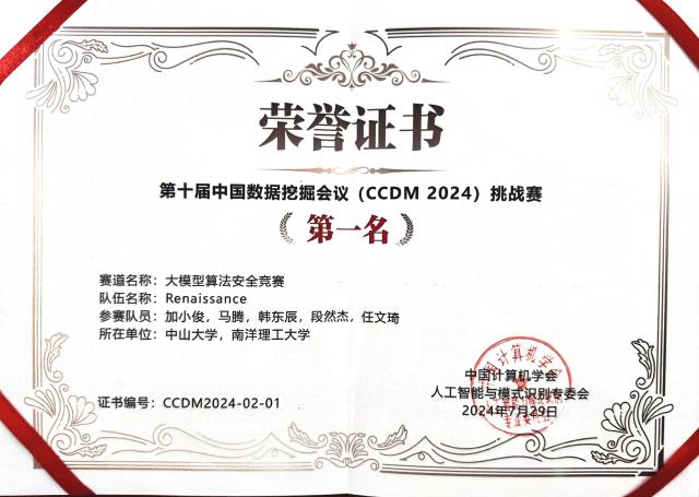 近日,第十届中国数据挖掘会议CCDM 2024特设官方赛Red Teaming多模态大语言模型红队安全挑战赛圆满落幕。由中山大学网络空间安全学院任文琦教授指导的队伍“Renaissance”荣获决赛第一名。队伍由我院研究生一年级准新生、二年级学生与南洋理工大学共同组成。