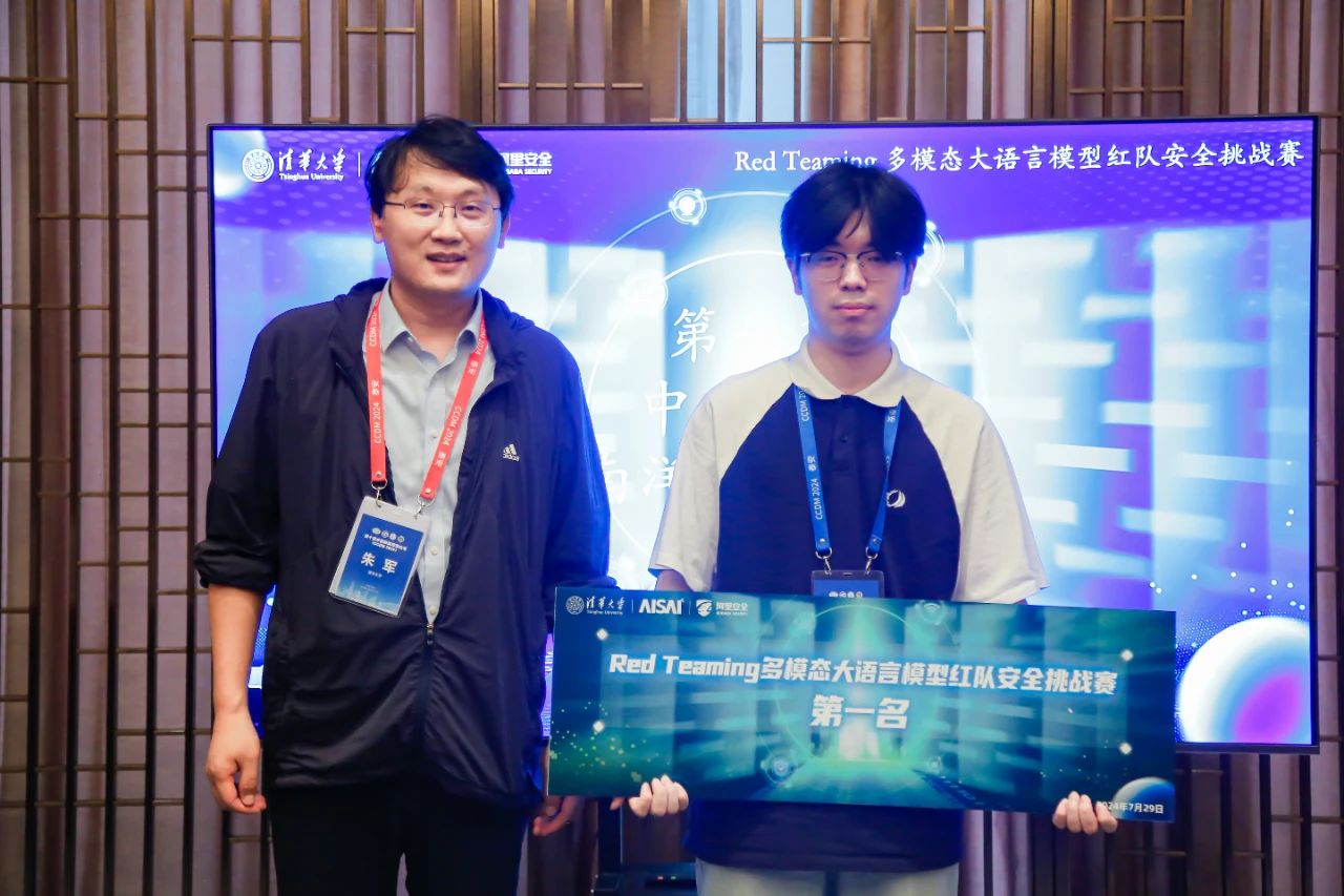 在初赛阶段,参赛者需提交600个图像文本对,用以评测多模态大模型的安全性以及攻击方法的优越性。“Renaissance”队伍提出了一种创新的基于排版的图文结合越狱攻击方法,在100多支参赛队伍中脱颖而出,以初赛第一名、复赛第一名的成绩挺进现场决赛。7月29日下午,会议现场的决赛答辩准时开始,我院研究生一年级准新生马腾第一个进行了汇报,介绍队伍所使用的攻击方法,回答了评委的问题。队伍创新的越狱攻击方法获得了评委们的一致好评,荣获现场决赛第一名的好成绩,总赛程第一名。