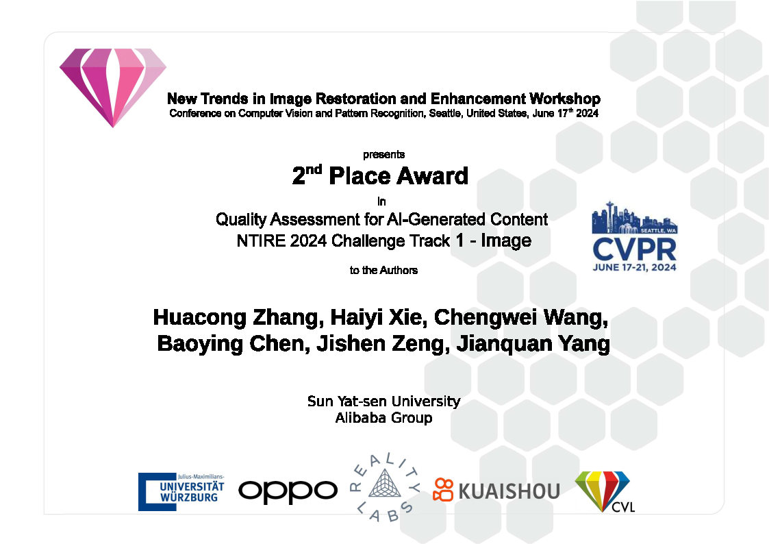 近日,计算机视觉国际顶级会议CVPR 2024举办的图像复原与增强国际挑战赛(New Trends in Image Restoration and Enhancement Workshop and Associated Challenges, NTIRE)陆续颁奖。由中山大学网络空间安全学院杨建权副教授指导,学院2022级研究生张华聪、2022级研究生谢海逸、2021级本科生王诚威与阿里巴巴安全部技术专家组成的队伍荣获AI生成内容质量评价-图像赛道亚军。