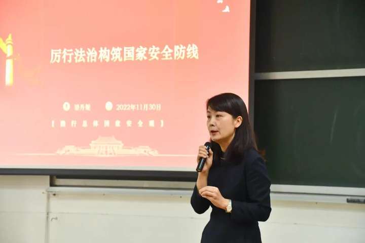 接着,梁丹妮副教授结合生动的事例和自身经验详细阐释了总体国家安全观的丰富内涵。通过案例分析,梁丹妮副教授从法律专业的角度阐释了国家数据安全层面面临的挑战,以数据安全法律引出网络安全法律知识,梳理了我国网络安全法律体系的发展进程,以此强调“没有网络安全就没有国家安全”的重要性,丰富和深化了同学们对网络安全的理解。